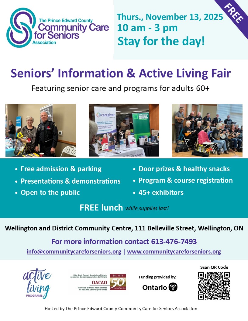 Prince Edward Community Care is hosting the seventh annual FREE Seniors Information and Active Living Fair. There will be over 50 vendors from the community showcasing the services they offer, as well as presentations and demonstrations. This event starts at 10:00am with Opening Ceremonies and activities until 3:00pm. Organizers recommend planning to attend for the full day. All are welcome! Free lunch & refreshments while supplies last. Call Community Care for more information about the fair at 613-476-7493. www.communitycareforseniors.org